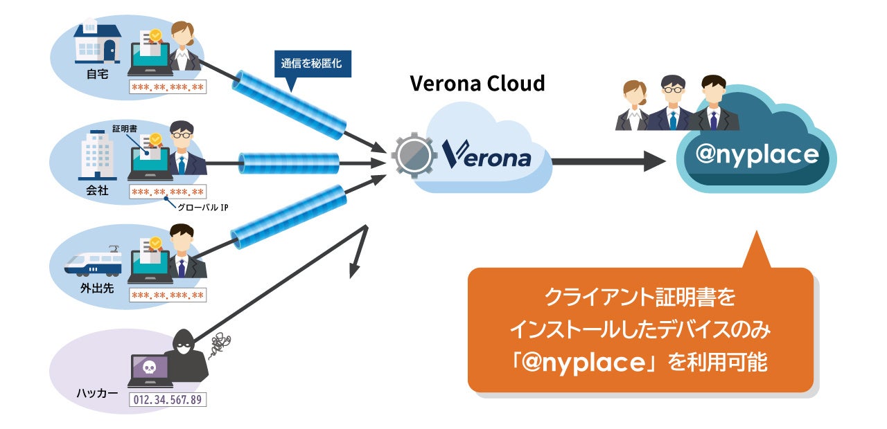 「Verona」は、デバイスとクラウドゲートウェイ間の通信をVPNで暗号化します。そのため本連携により、自宅や外出先で「@nyplace」を利用する場合でも、通信の傍受やなりすましから情報を守ることができます。
