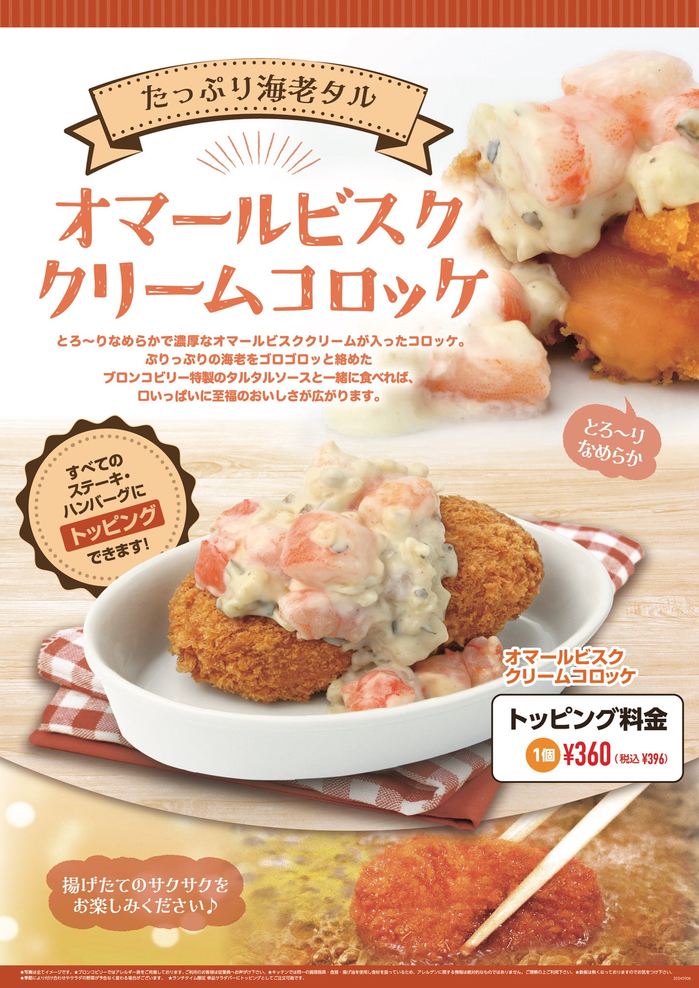 また、復活を期待するお声も多かった『オマールビスククリームコロッケ』がトッピングとして再登場。とろ~りなめらかな濃厚オマールビスククリームコロッケは、ぷりっぷりの海老がたっぷり入った特製タルタルソースとの相性が抜群!口に入れた瞬間、海老が踊り出します。すべてのメインメニューにトッピングができますので、様々なメニューとの組み合わせをお楽しみください。