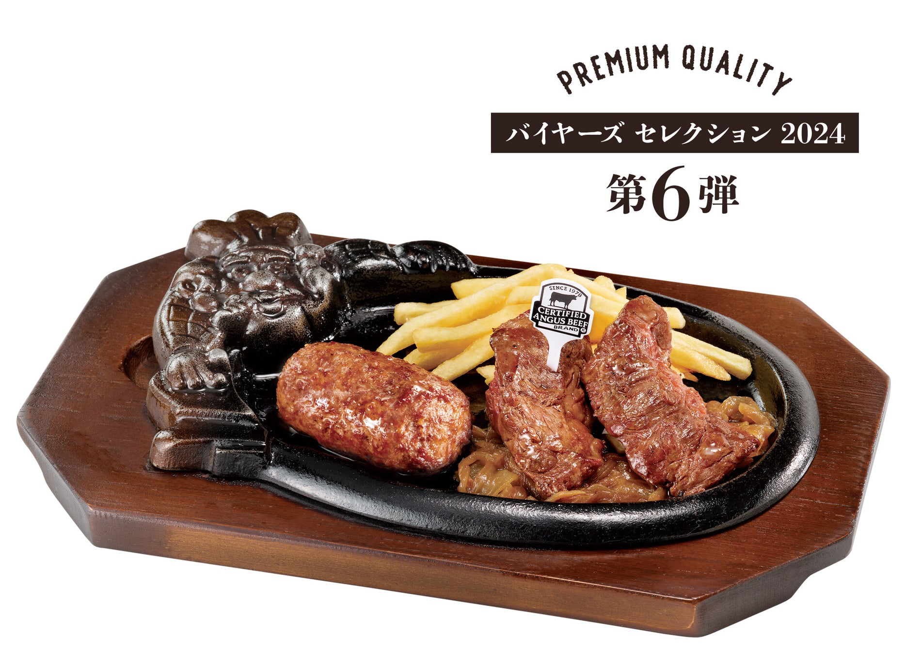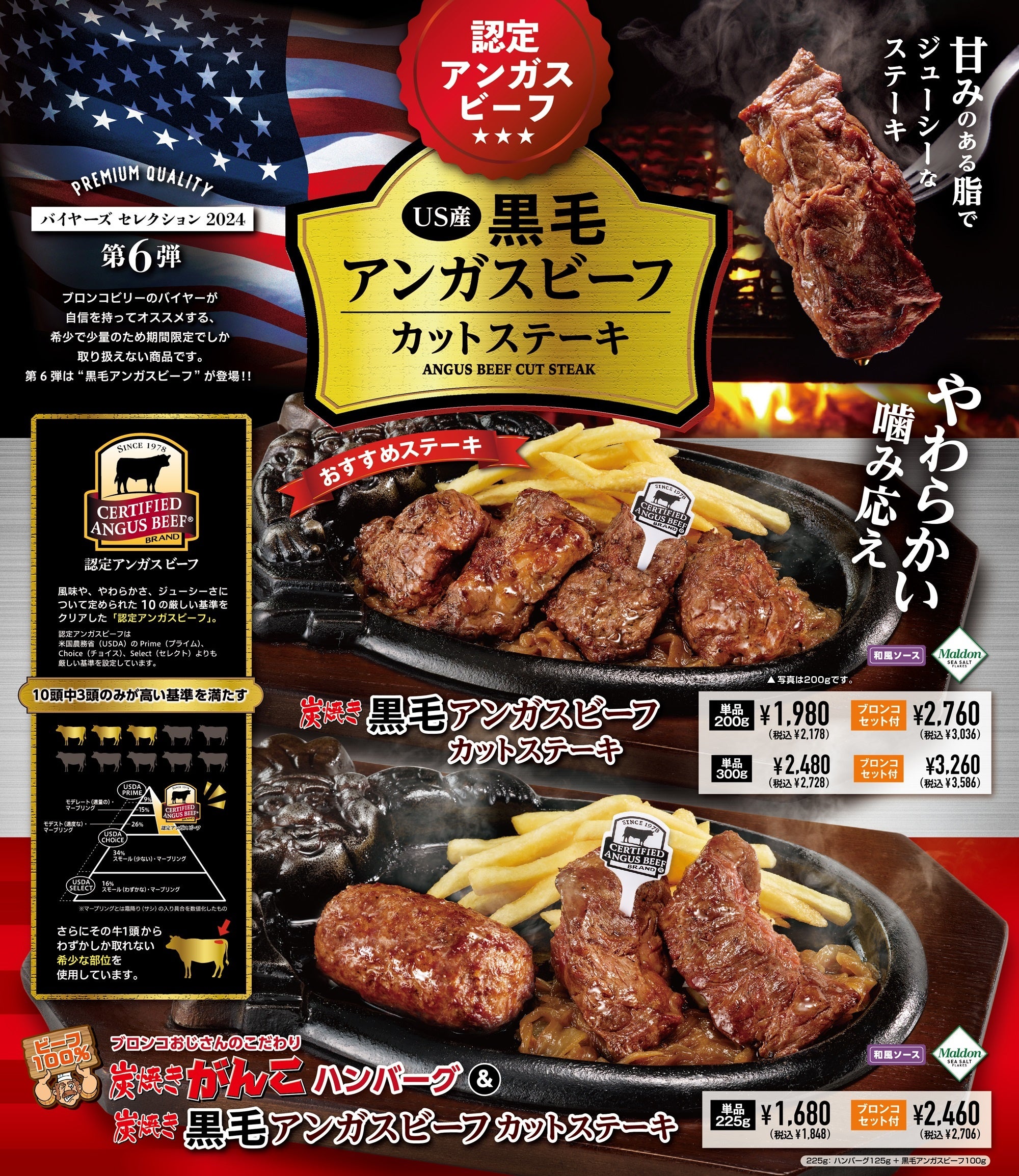 ステーキハウス ブロンコビリーは、”食欲の秋”にぴったりな新メニューをご用意いたしました。40年以上肉と向き合い、世界中のお肉を食べてきた当社バイヤーが自信を持ってオススメする大人気企画「バイヤーズセレクション2024」の第6弾は、美味しさとやわらかさを兼ね備えた『炭焼き黒毛アンガスビーフカットステーキ』を提供します。10頭中3頭のみが認定されるアメリカ産認定アンガスビーフの希少部位で、赤身肉ですが脂身もほどよくつき、濃厚な味わいの食べ応えがあるカットステーキです。人気No.1ビーフ100%「炭焼きがんこハンバーグ」とのコンビメニューもございます。