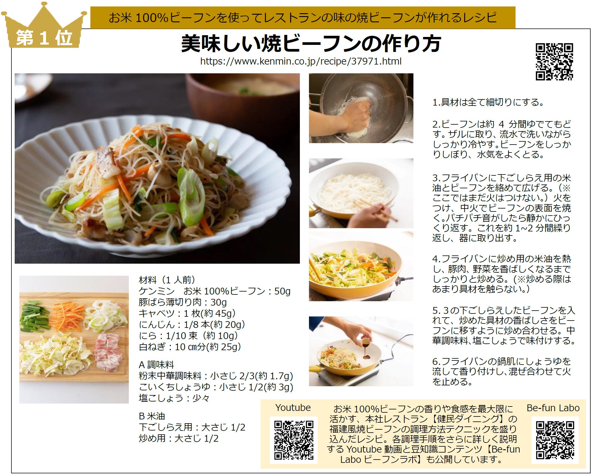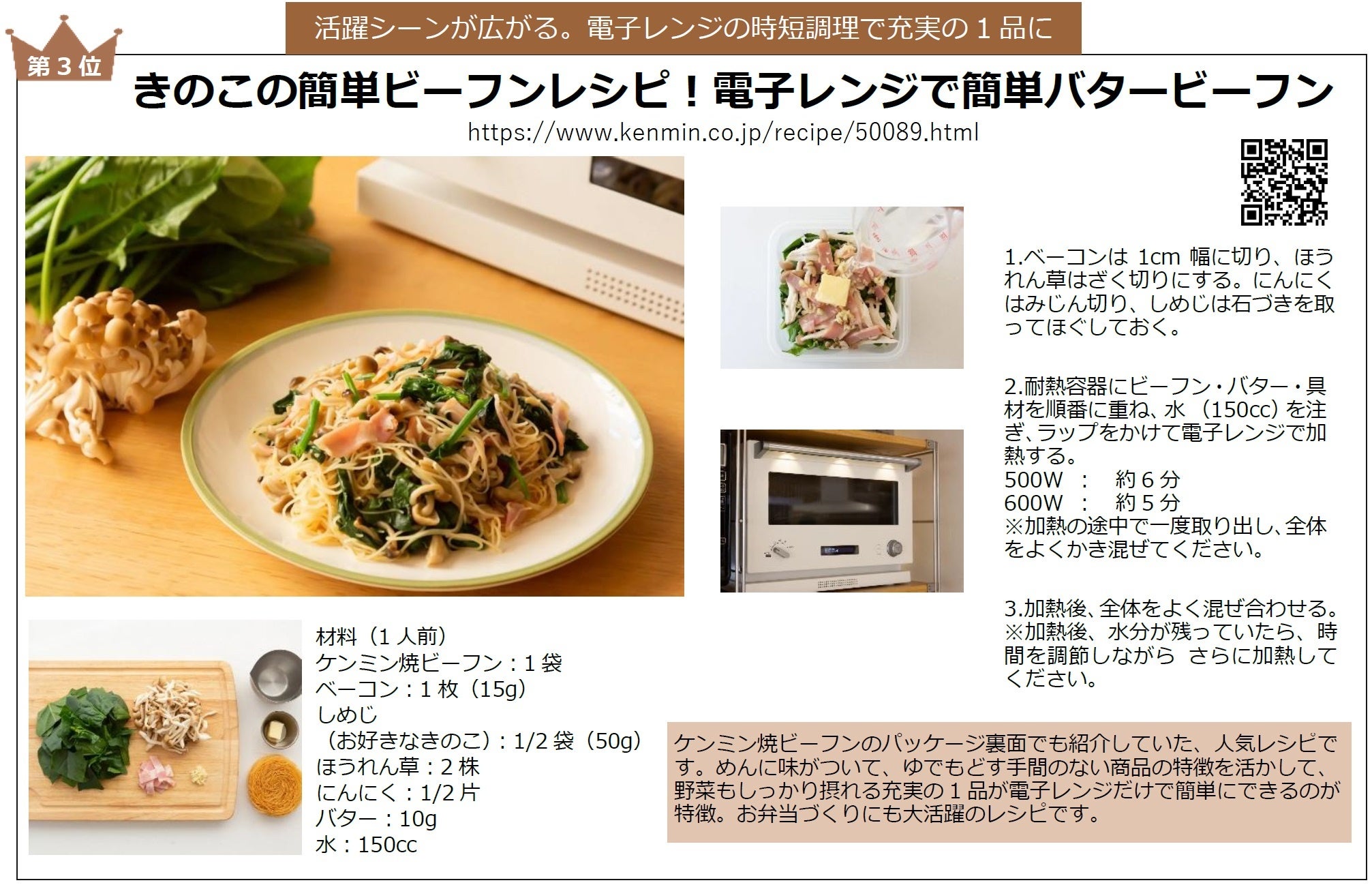 - 第3位 きのこの簡単ビーフンレシピ!電子レンジで簡単バタービーフン https://www.kenmin.co.jp/recipe/50089.html