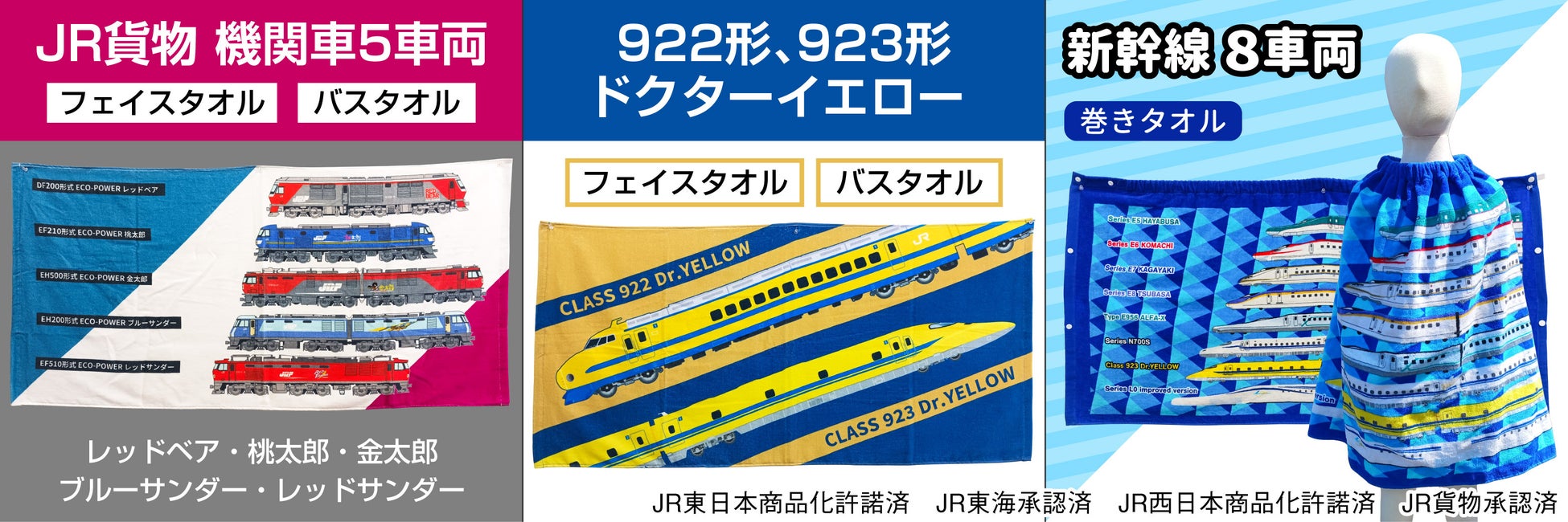 JR貨物 機関車5車両、新旧ドクターイエロー、新幹線8車両がデザインされたフェイスタオル・バスタオル・巻きタオル各種を新発売!