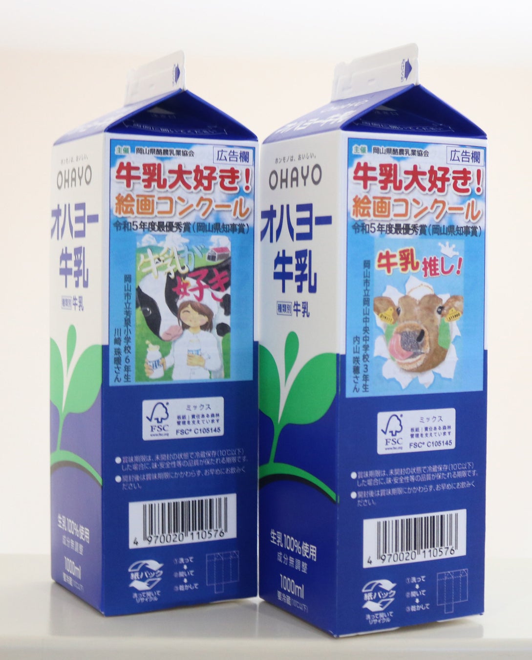 オハヨー乳業さんには、最優秀賞を受賞した作品を「オハヨー牛乳」のパッケージに掲載していただいています。「オハヨー牛乳」は岡山県内を中心に配送されており、多くの消費者が小中学生の作品を見ながらおいしく牛乳を飲んでいると思います。また、このパッケージを見てコンクールに応募している小中学生も多いと思います。