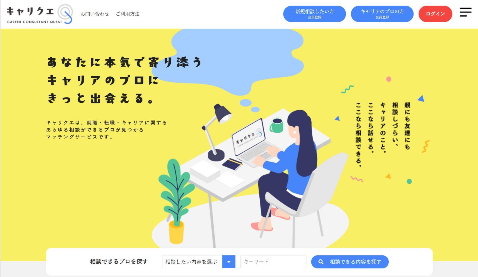 「キャリクエ」では就職や転職などキャリアに関する相談を行うことができます。しかも相談に乗ってくれるのは、人事経験者やキャリアコンサルタントの資格保有者など実績のある審査済みのプロのみで、企業紹介などの勧誘もなく、安心してキャリアの悩みを相談することができます。