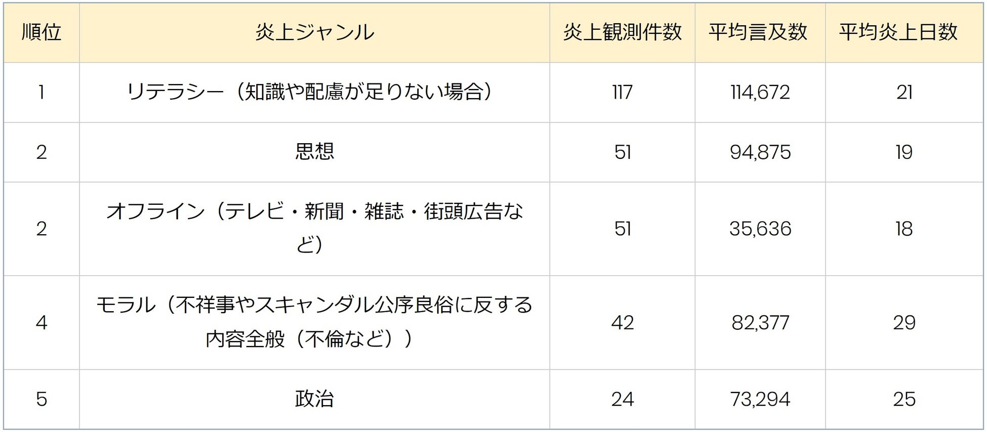 ~炎上ジャンル別の炎上件数1位は「リテラシー不足」に~