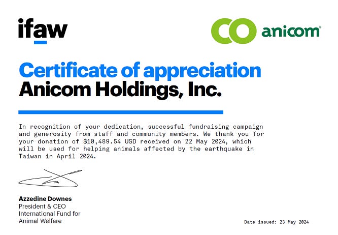 アニコム ホールディングス株式会社(東京都新宿区、代表取締役 小森 伸昭、以下 アニコム)は、「台湾東部沖地震におけるペット救援募金」(2024年4月10日~5月12日)を通じて、皆さまからいただいた寄付金と、アニコムグループ社員からの寄付とあわせて、合計1,670,548円(10,489.54米ドル、5月22日時点)を2024年5月22日にIFAW(国際動物福祉基金)へ寄付いたしました。ご協力いただいたすべての方々に、心より御礼申し上げます。