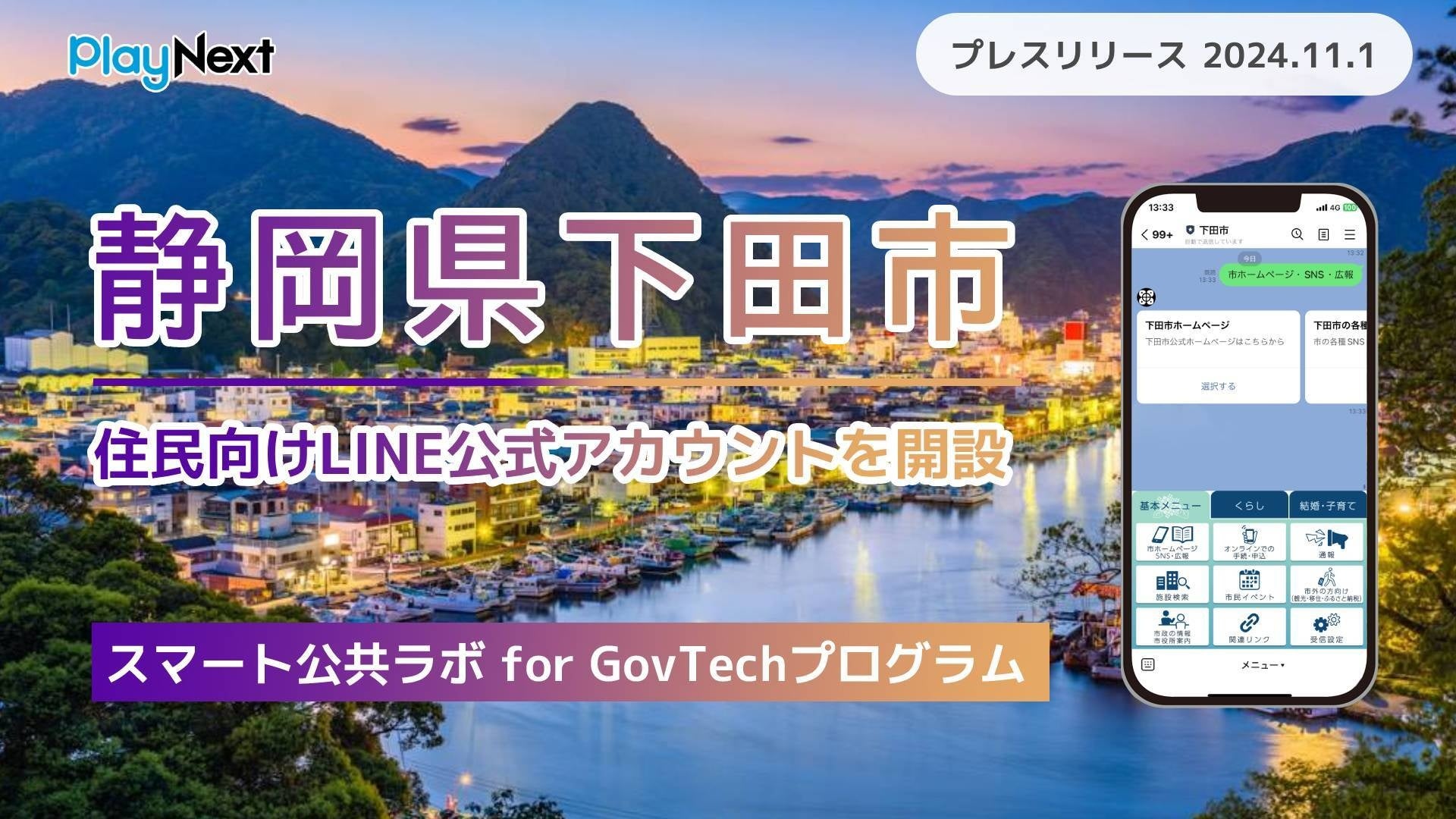 プレイネクストラボ株式会社(本社:東京都品川区、代表取締役:柏 匠、以下 「プレイネクストラボ」)は、静岡県下田市(以下「下田市」)のLINE公式アカウントを「スマート公共ラボ for GovTechプログラム」を活用して新規開設し、2024年11月1日(金)より運用を開始することをお知らせします。