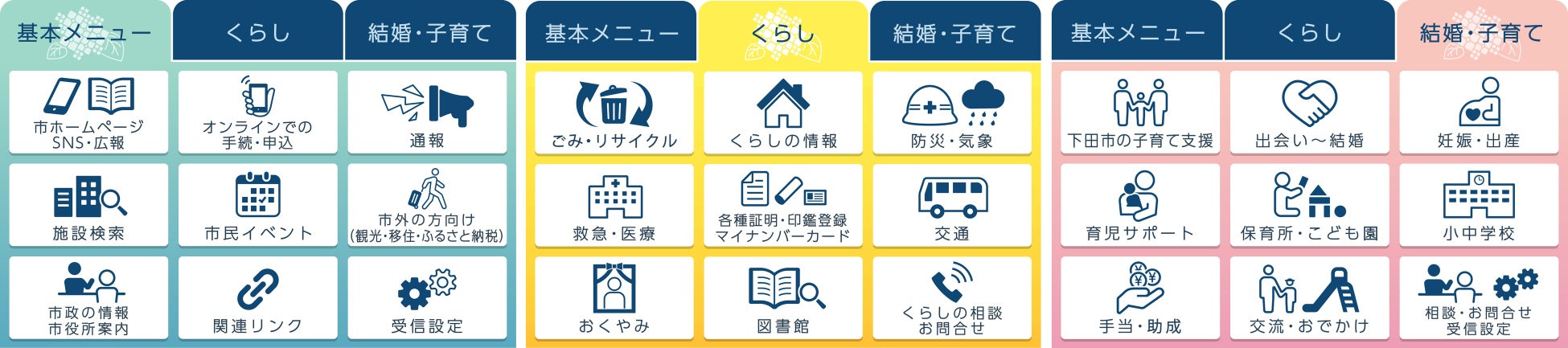 「基本メニュー」「くらし」「結婚・子育て」のメニューから様々な情報を検索することが可能になりました。