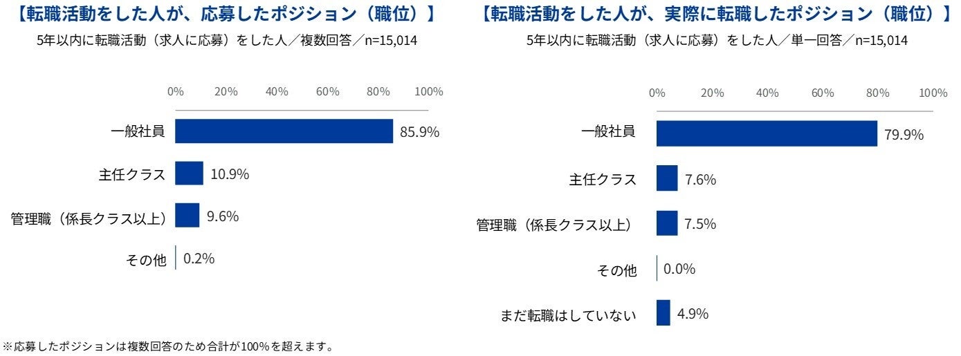 管理職への転職者は、転職者全体の1割未満:直近5年以内に転職した人のうち、管理職(係長以上)求人に応募した人は9.6%、実際に管理職に転職した人は7.5%。