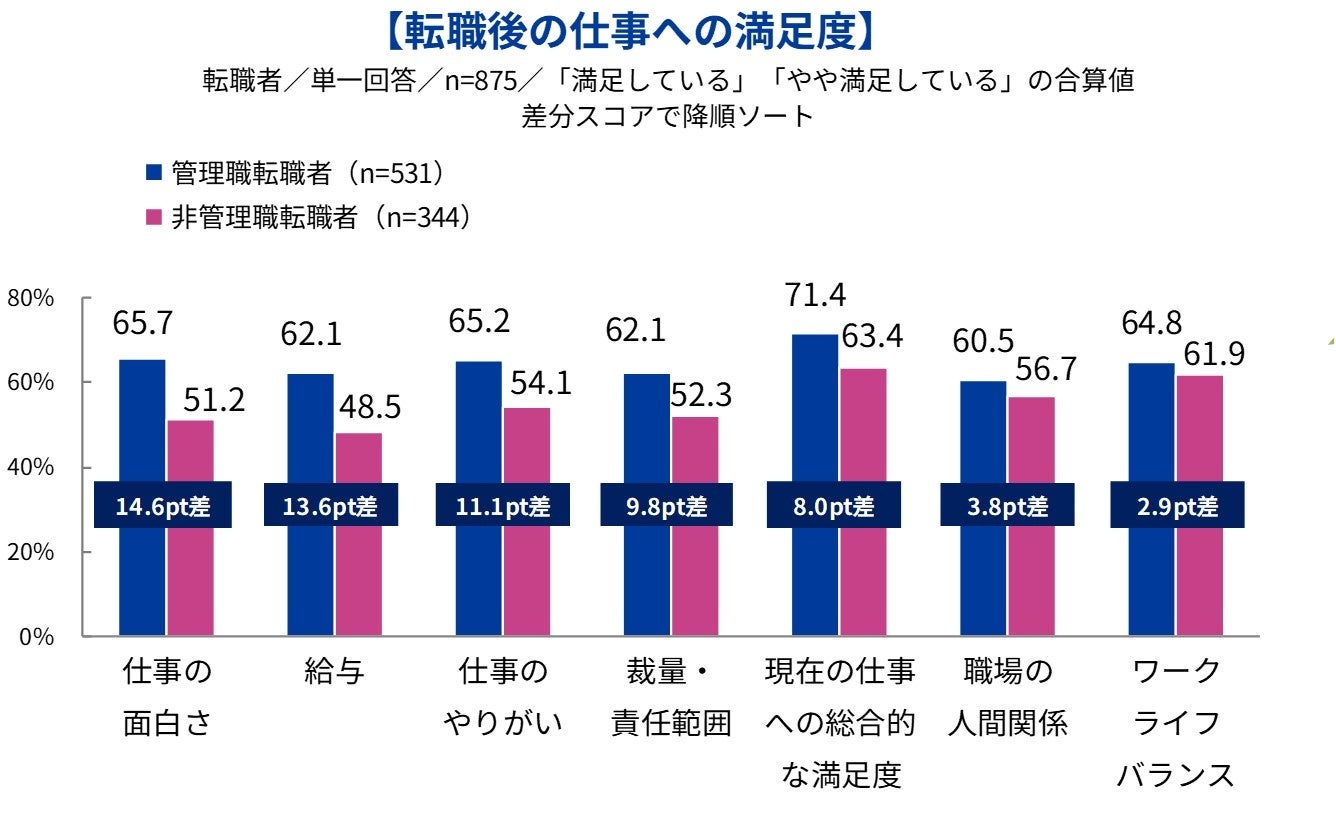 転職後の仕事に満足している割合が高い:管理職転職者の方が非管理職転職者よりも、転職後の仕事へ満足している割合が高い。特に、「仕事への面白さ」(管理職65.7%、非管理職51.2%が満足:14.6pt差)、「給与」(管理職62.1%、非管理職48.5%が満足:13.6pt差)、「仕事のやりがい」(管理職65.2%、非管理職54.1%が満足:11.1pt差)に差が生じている。