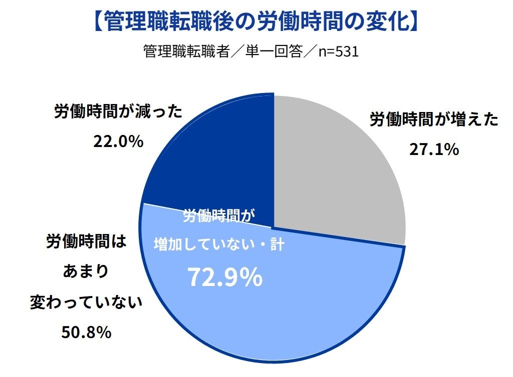 また、「ワークライフバランス」に関しても、大きな差はなかったものの、管理職転職者の64.8%が満足しており、非管理職転職者61.9%を上回る結果となりました。なお、管理職転職者に、転職後に勤務時間が増えたかどうかを尋ねたところ、27.1%が「労働時間が増えた」、50.8%は「あまり変わらない」、22.0%が「労働時間が減った」と回答しており、7割以上(72.9%)は労働時間が増加していない(変化なし、もしくは減少)ことがわかりました。