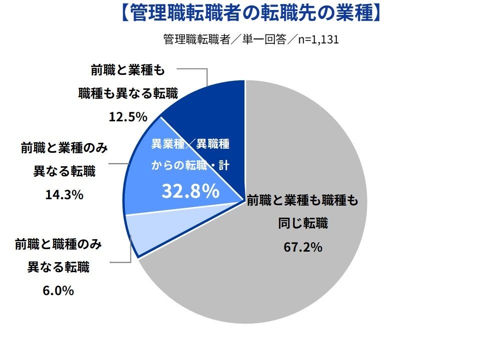一方、業種も職種も前職とは異なる、異業種・異職種の管理職への転職者は12.5%でした。また、同業種・異職種の転職は6.0%、異業種・同職種の転職は14.3%で、合わせると32.8%が異業種または異職種からの転職であることがわかりました。