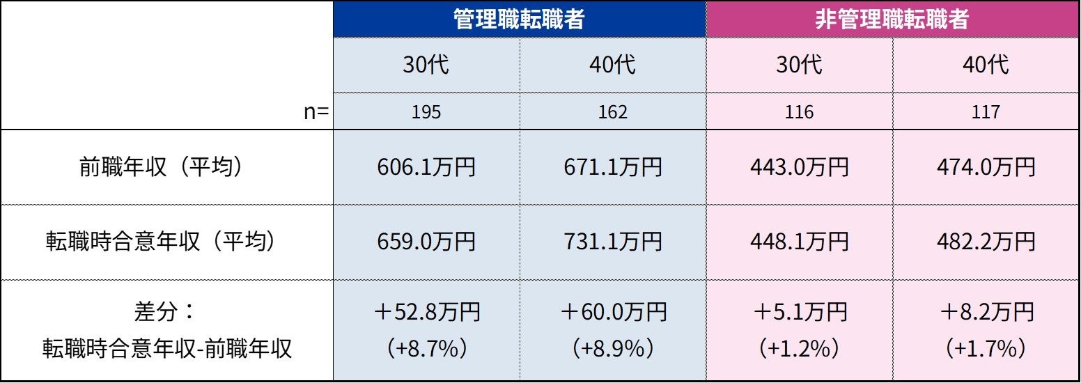 一方、非管理職転職者では、30代で転職前の平均年収が443.0万円、転職合意時の平均年収は448.1万円で、平均5.1万円アップ(平均1.2%アップ)でした。40代では転職前の平均年収が474.0万円、転職合意時の平均年収は482.2万円で、平均8.2万円アップ(平均1.7%アップ)でした。管理職転職者の方が、非管理職転職者よりも、転職による給与のアップ率が高い傾向にあることがわかります。