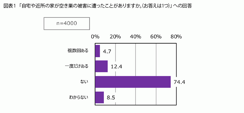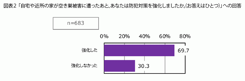 まず、自宅や近所の家が空き巣の被害に遭ったことがあるかを聞いたところ(図表1)、「ない」という回答が74.4%でしたが、「一度だけある」が12.4%、「複数回ある」が4.7%でした。約6人に1人が自身や身の回りで空き巣を経験しているという結果です。