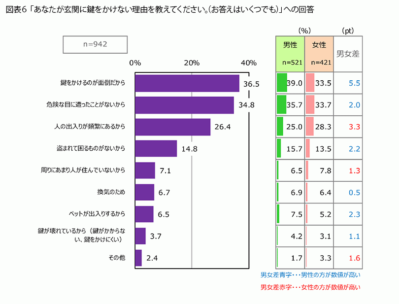 「鍵をかけるのが面倒だから」と答えた人は男性が39.0%、女性が33.5%です。男性のほうが5ポイント以上高くなっていますが、「人の出入りが頻繁にあるから」(全体:26.4%、男性:25.0%、女性:28.3%)という人は女性のほうが3ポイント高いです。総じて、施錠しない理由については、大きな男女差がないと言えそうです。