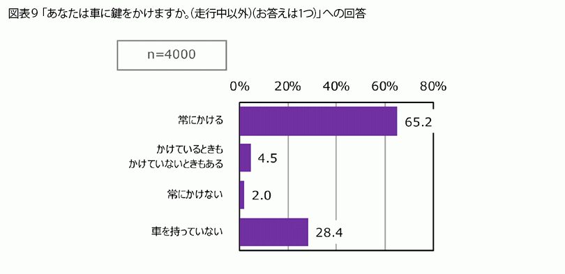 車を持っている人だけで考えると、「常にかける」人が91.0%になり、ほぼ9割です。玄関に施錠するかという質問(図表4)では、「常にかける」が76.5%だったので、家よりも車のほうが、常に施錠する人の割合が高いことになります。