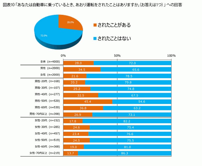 次に、近年、大きな問題になっているあおり運転に関する質問です。あおり運転をされた経験があるかを聞くと(図表10)、「されたことがある」と回答したのは28.0%でした。
