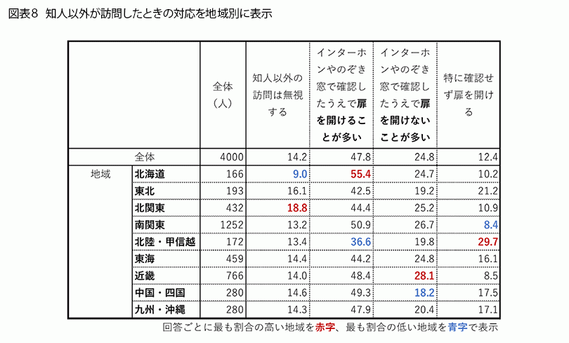 一方、「知人以外の訪問は無視する」の割合が最も高いのは北関東(18.8%)です。玄関を常に施錠する人の割合が最も低かった東北ですが(図表5)、「知人以外の訪問は無視する」割合が北関東の次に高いという結果でした。
