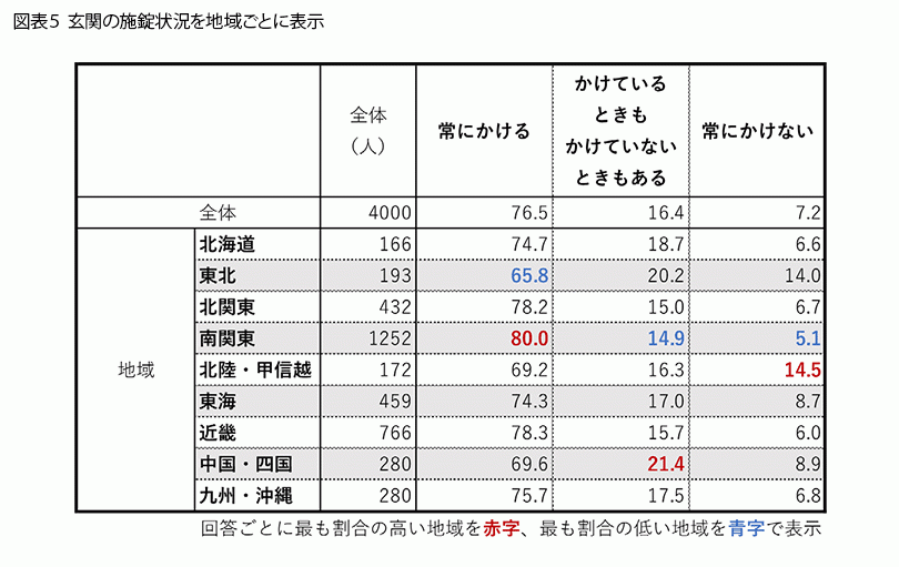 また、玄関の施錠状況を地域別で見ても差がありました(図表5)。「常にかける」と回答した割合が最も高いのが南関東の80.0%です。同時に、南関東は「常にかけない」と回答した人の割合が最も低い5.1%でした。