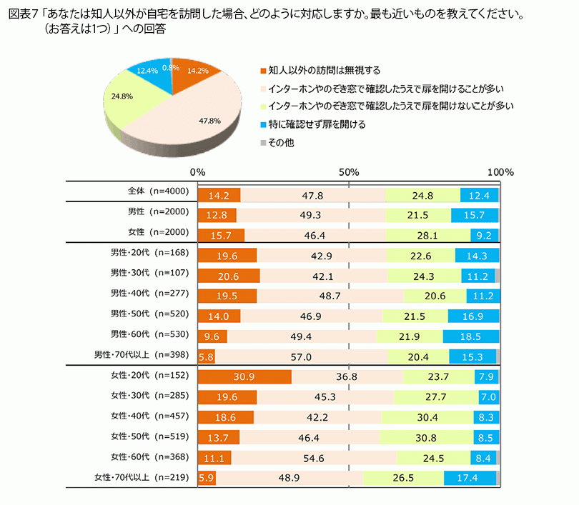 「知人以外の訪問は無視する」の割合がほかの年代と比べて飛び抜けて高いのが女性・20代です。全体では14.2%のところ、女性・20代では30.9%になっています。