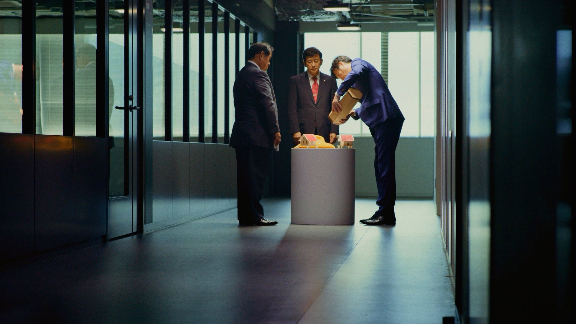 3社長が社員を引き連れ、真剣な面持ちで廊下に集結。