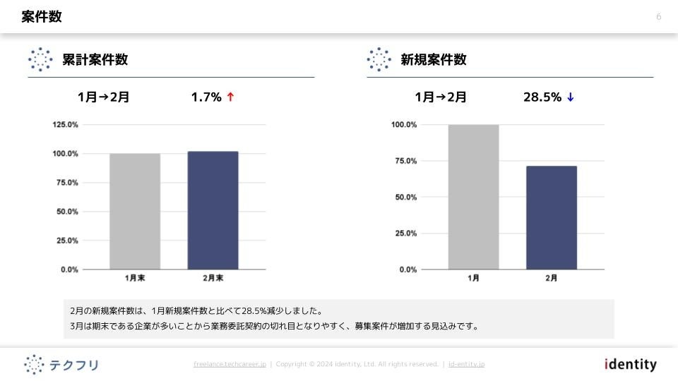 2月の新規案件数は、1月新規案件数と比べて28.5%減少しました。3月は期末である企業が多いことから業務委託契約の切れ目となりやすく、募集案件が増加する見込みです。