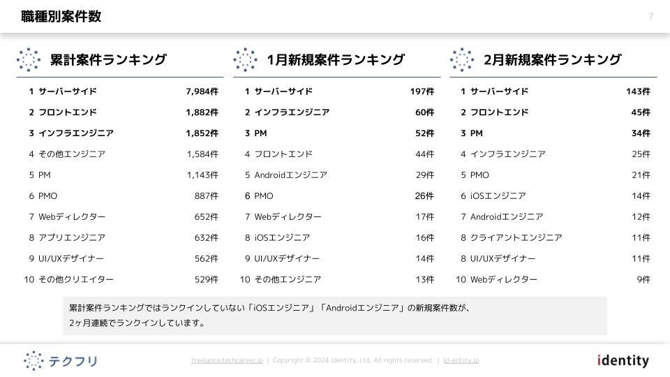 累計案件ランキングではランクインしていない「iOSエンジニア」「Androidエンジニア」が、2ヶ月連続でランクインしています。