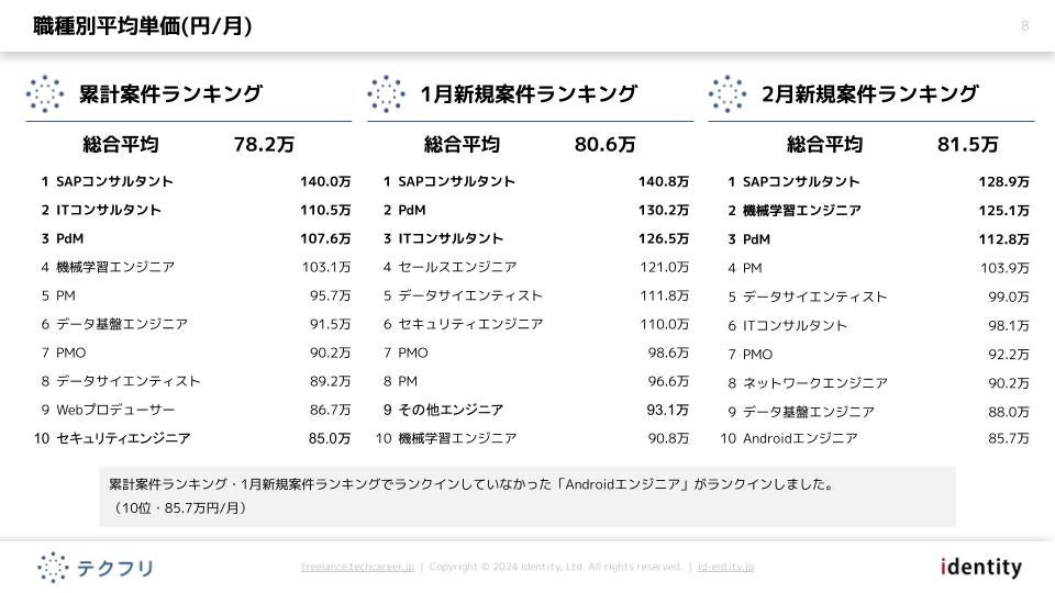 累計案件ランキング・1月新規案件ランキングでランクインしていなかった「Androidエンジニア」がランクインしました。(10位・85.7万円/月)