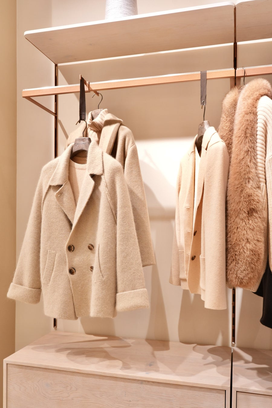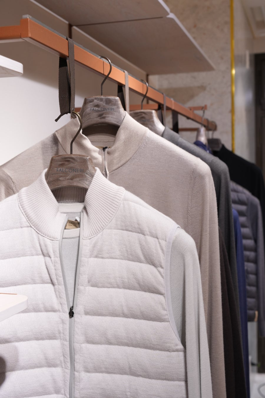 特にFALCONERIのアイコニックなカシミヤ糸「ウルトラファイン2.50」は、体温調節、伸縮性、通気性に非常に長けており、ウルトラファインのセーターは一年を通じて着ることができます。そのほか、カシミヤのジャケットやアウター、そして人気のリバーシブルダウンベストは、デイリー使いにも、ゴルフや旅行にもお薦めです。