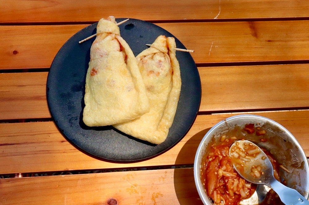 餅きんちゃくの発想で、お好みの食材を詰めて焼けば新感覚のおつまみキャンプ飯に。今回は、たれ味の焼き鳥缶を使って、ヤンニョムチキンやチーズタッカルビをほうふつとさせる韓国風の味にしてみました。