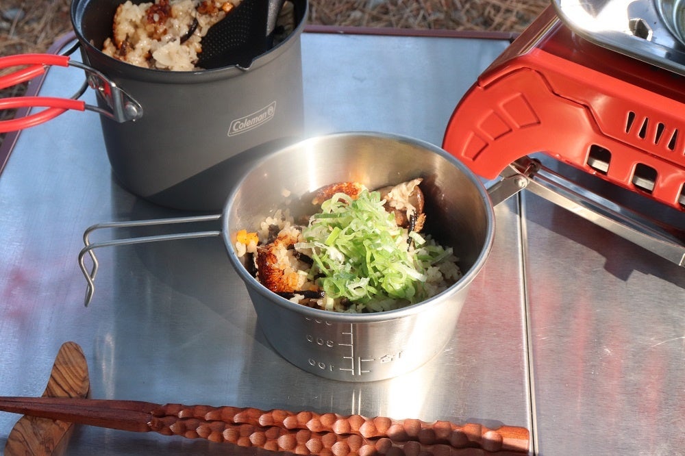 沖縄の祝い事に欠かせない、ご当地炊き込みご飯「じゅーしー」をキャンプ飯で再現。シンプルながら、豚肉やひじき、しいたけのうまみが効いていて、何杯でも食べられる味わいです。