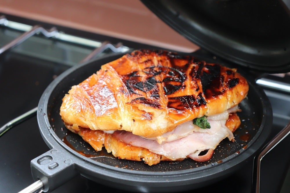 食パンで作るホットサンドもおいしいけど、他のパンではさんでみると、味の可能性が広がります。たとえば、クロワッサン。はちみつでかりかりに焼き、いつもの具をはさめば、最高の朝キャンプ飯に。