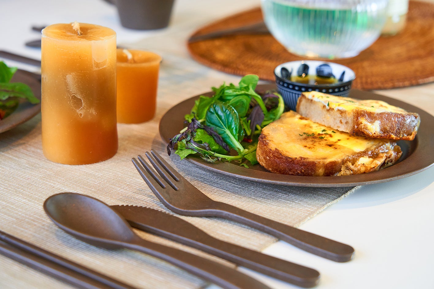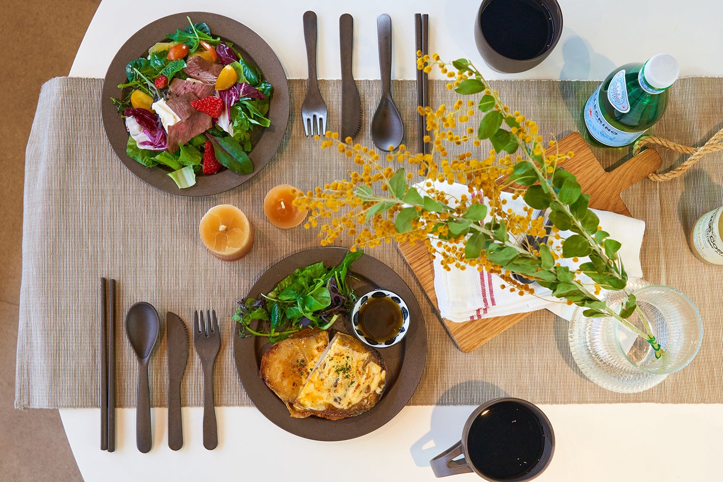 料理を引き立てるシックな色合い。セットで揃えて食卓に統一感を演出。