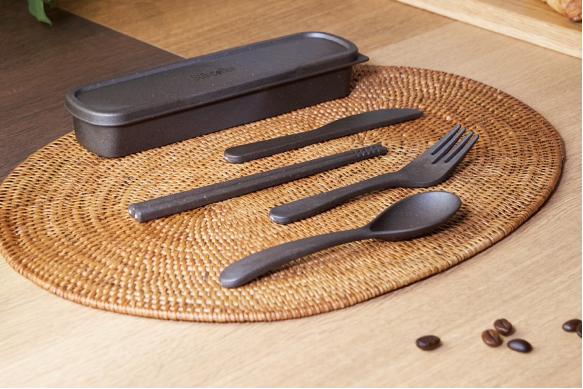 廃棄予定のコーヒー抽出後のかすを15%使用したカトラリー。スプーン・フォーク・ナイフ・箸の嬉しい4点セットです。ケースまで丸ごと洗えて衛生的かつ、丸みある形状が個性的でおしゃれです。*製品によって個体差があります。