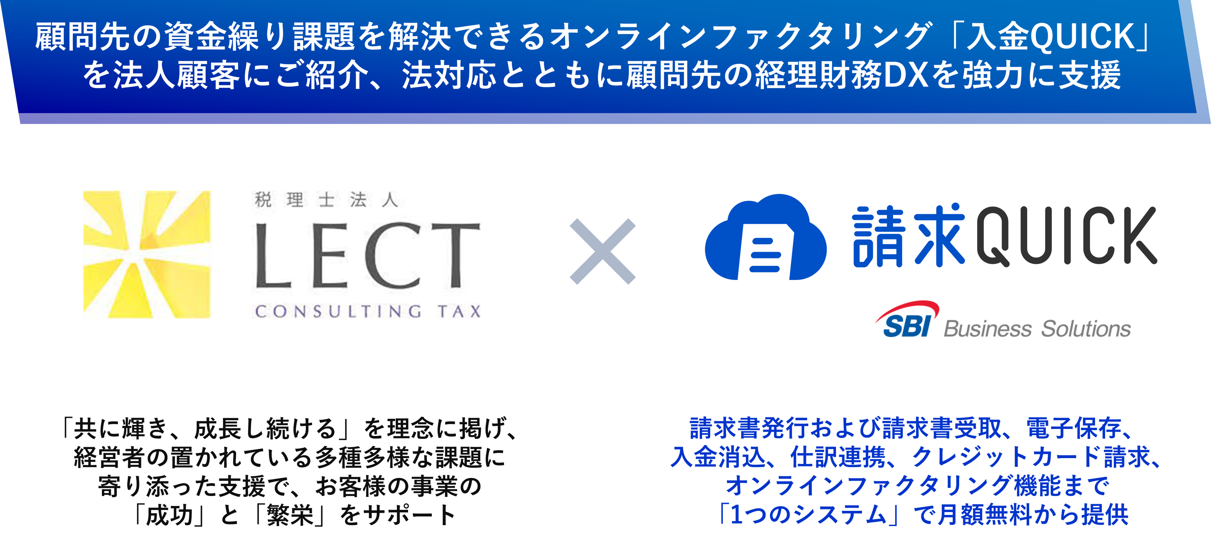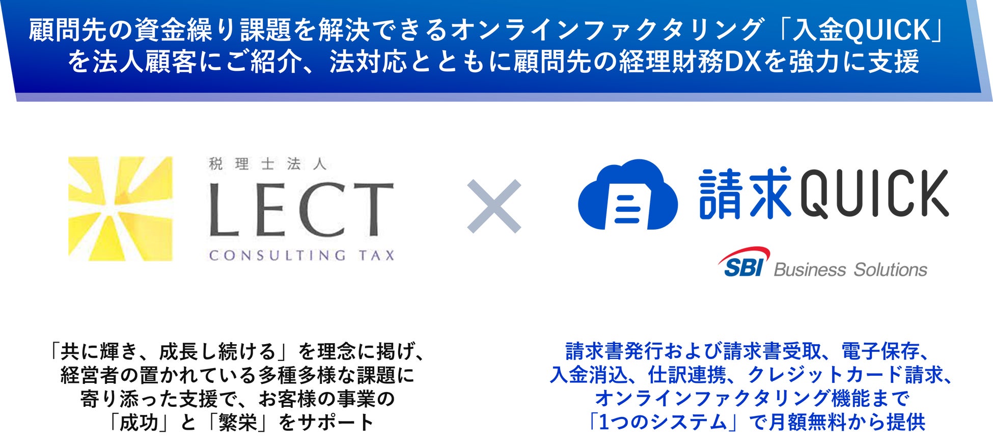 総合フィンテックソリューション企業であるSBI FinTech Solutions株式会社の子会社で、バックオフィス支援サービスを提供するSBIビジネス・ソリューションズ株式会社(本社:東京都港区、代表取締役社長:夏川 雅貴、以下「当社」)は、経理のさまざまな課題を解決し、DXを加速するクラウド型請求書管理システム「請求QUICK」におけるパートナープログラムにおいて、税理士法人LECT(本社:愛知県名古屋市、代表社員 税理士:津谷 光一郎 / 八田 尚哉)にご参加いただきましたのでお知らせいたします。