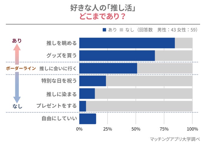 今回、株式会社ネクストレベル(本社所在地:神奈川県横浜市、代表取締役:田中大洋)が運営するマッチングアプリ大学(https://jsbs2012.jp/)では、恋人や夫婦のどちらかが推し活をしている203名の男女に、推し活してるのはありなのか?」、許容できる範囲などについてアンケート調査を実施しました。