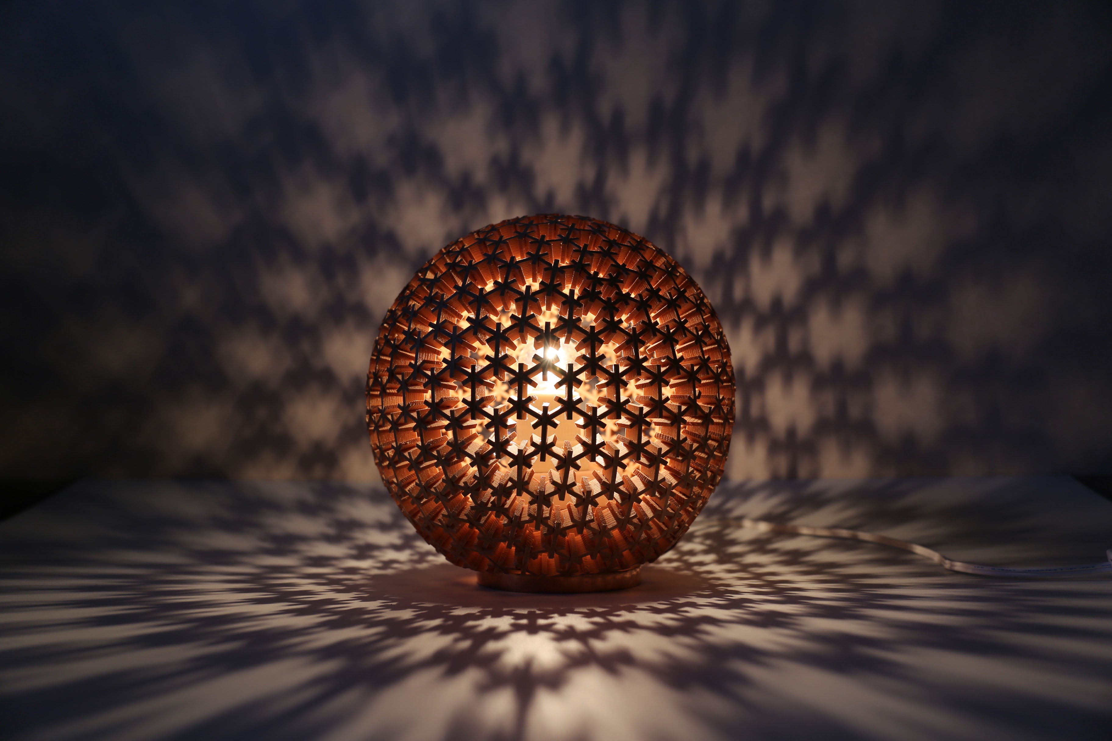 伝統工藝「組子」の技術を応用することで、木を「組む」だけで球形状を実現。平面的に思われがちな組子を3次元に拡がる球体組子として表現しています。唯一無二の技術をもつ職人とともに共同開発。