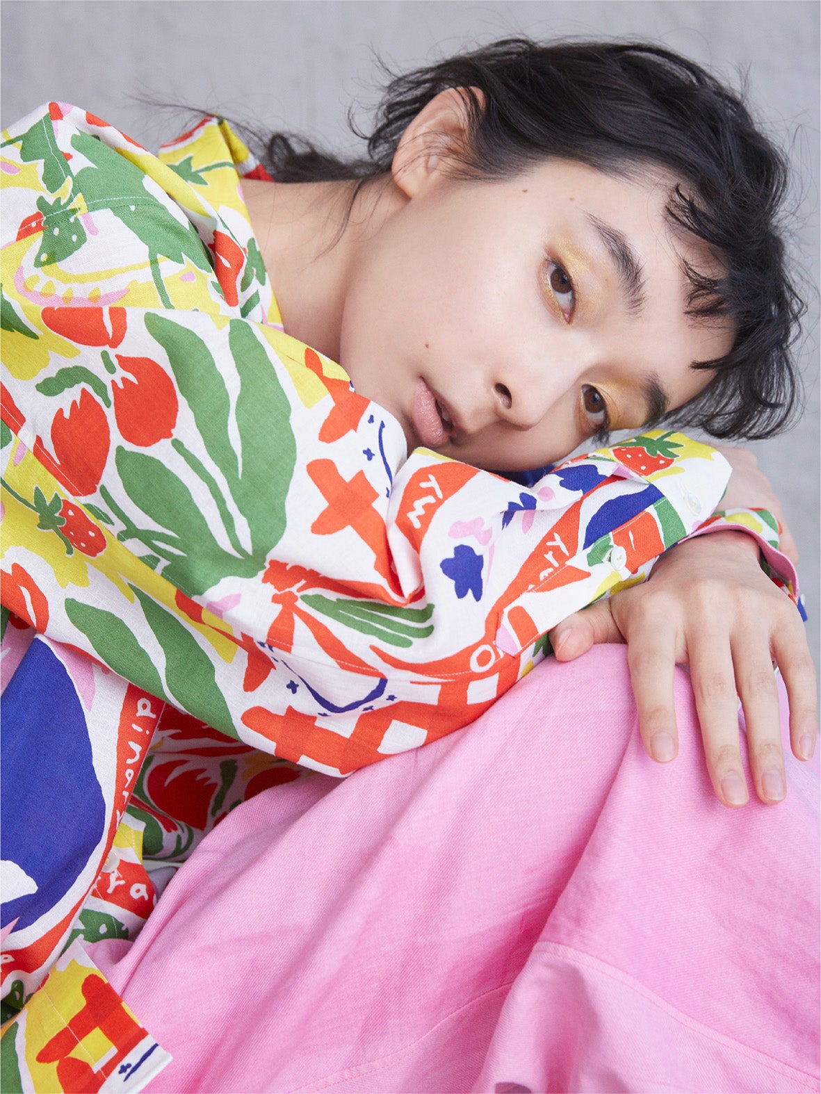 「ピースフルなメッセージをテキスタイルにのせて贈る」をコンセプトに手描きのドローイングをプリントしたテキスタイルの服と雑貨を製作するほか、コラボレーションやアートワーク制作など幅広く活動中。