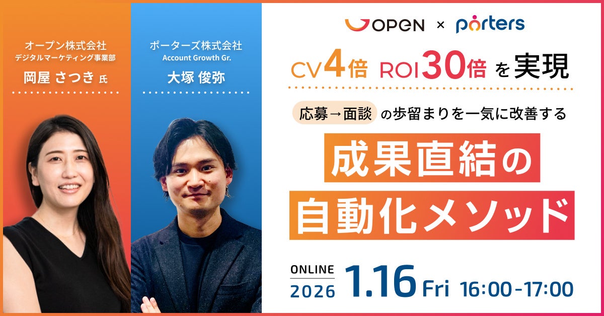 人材ビジネス向けマッチングシステムを提供するポーターズ株式会社(東京証券取引所グロース.証券コード5126、東京都港区、代表 西森 康二)は、オープン株式会社(以下、オープン)と共同で「CV4倍・ROI30倍を実現。 応募→面談の歩留まりを一気に改善する、成果直結の自動化メソッド」と題した無料セミナーを2026年1月16日(金)16:00~オンラインで開催いたします。