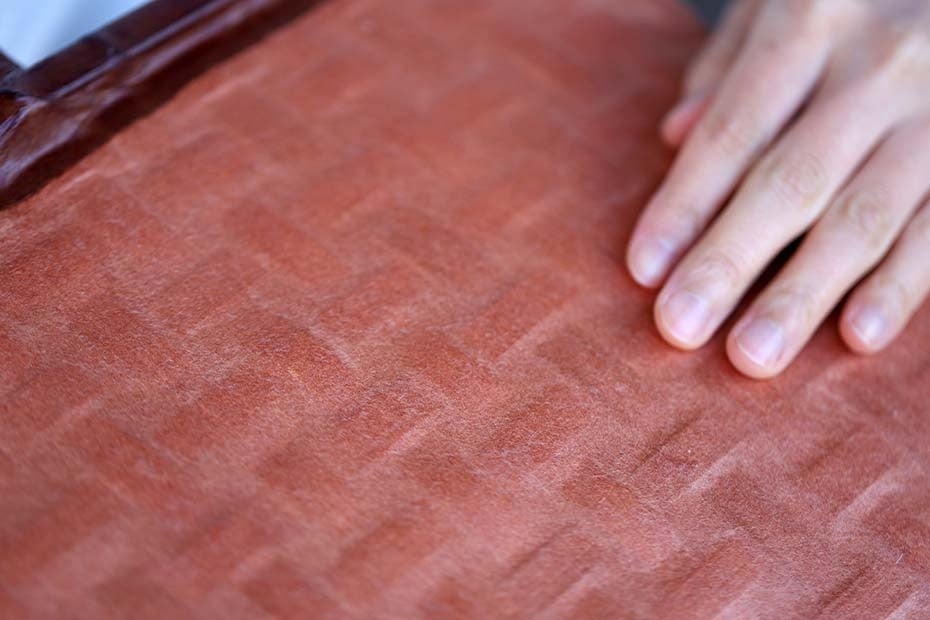 一閑張りは江戸時代から続く日本の伝統技法です。この手提げ籠は真竹を四ツ目編みした上に和紙を丁寧に貼り重ね、柿渋を五回も塗布して仕上げられています。この念入りな工程によって、耐久性が高められると同時に、自然素材が持つ温もりや優しい風合いが引き立つ特別な仕上がりとなっています。竹、和紙、柿渋という日本古来の素材を用い、それぞれの特性を活かしながら、一つひとつ熟練の職人による手作業で丁寧に作られています。