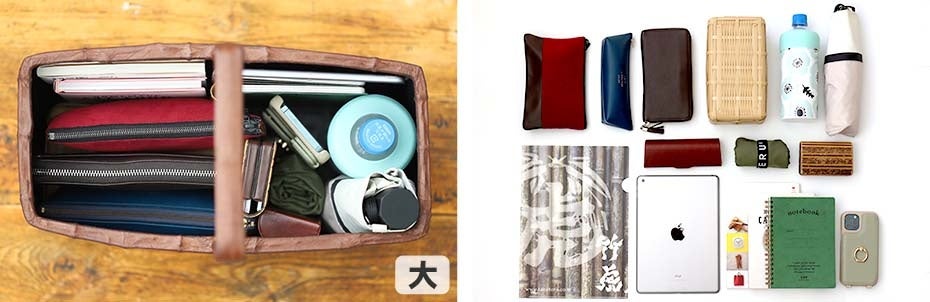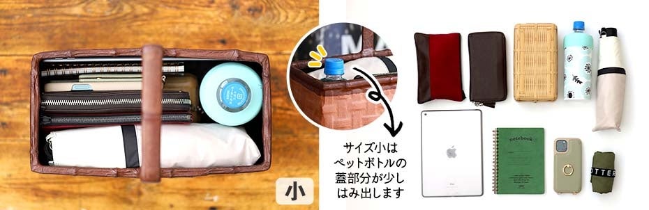 デザイン面でも実用性と美しさを両立させており、スクエア型のフォルムは、端までしっかりと収納できる機能性を備えています。大サイズはA4クリアファイルやタブレット、お弁当箱、本、折りたたみ傘、ペットボトルなどを難なく収納でき、日常使いから行楽まで幅広いシーンで活躍します。一方、小サイズは、お財布やスマートフォン、タブレットなど、必要最低限の荷物をしっかり収納できるため、身軽に出かけたいときにぴったりです。一本持ち手は、持ちやすさと使いやすさを追求した設計で、買い物籠としてはもちろん、インテリアや小物入れ、花篭など、多用途に活用できます。