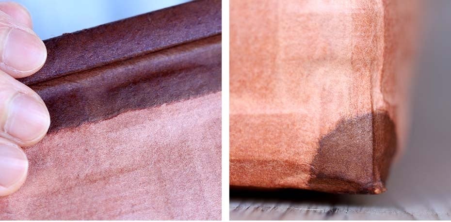 また、持ち手や縁取りの色合いは全体的なバランスがよく、高級感のある仕上がりとなっています。底の角部分には、あえて異なる色合いの和紙を貼ることで、さりげないアクセントを加えています。内側の和紙は外側よりも濃い色合いで仕上げられ、口幅が広く、中のものを出し入れしやすい工夫が施されています。こうした細部へのこだわりが、職人技の真髄を物語っています。
