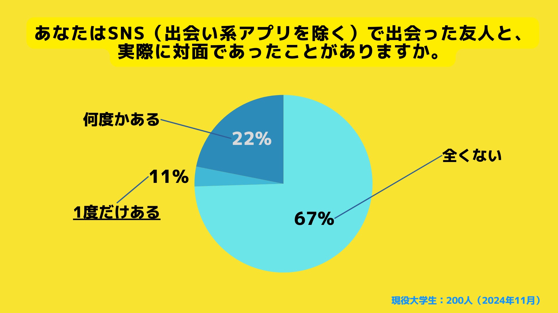 大学生にSNS(出会い系アプリを除く)で出会った友人と、実際に対面で会ったことがあるか聞いたところ、67%の大学生が全くないと回答しました。