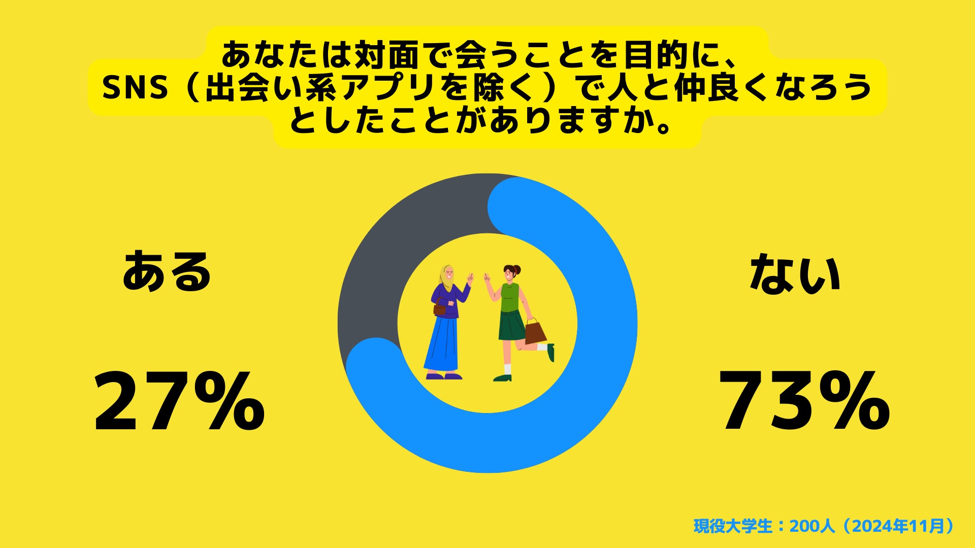 対面で会うことを目的に、SNS(出会い系アプリを除く)で人と仲良くなろうとしたことがあるか、聞いたところ、27%の大学生がある、73%の大学生がないと回答しました。