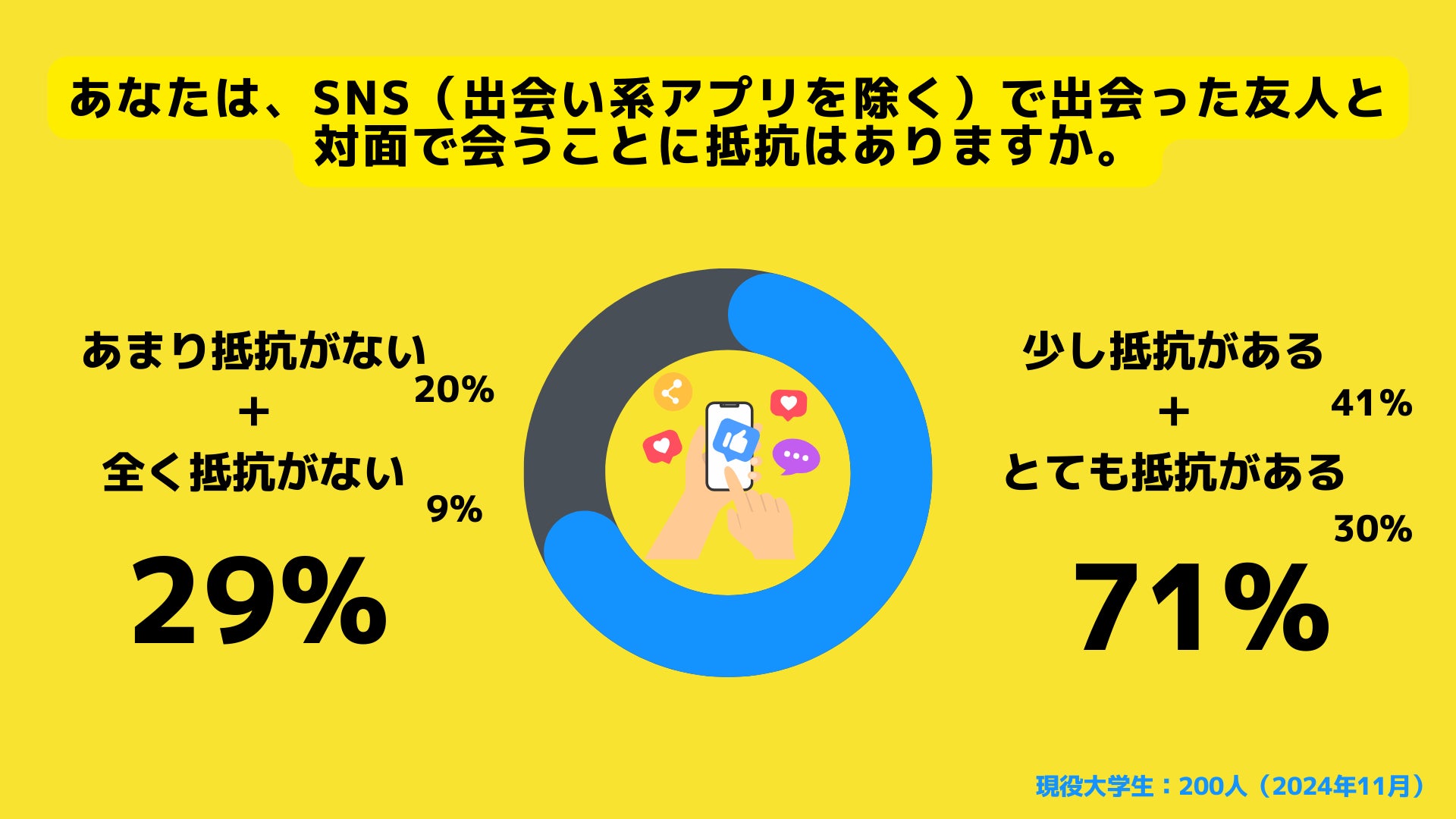 またSNS(出会い系アプリを除く)で出会った友人と、実際に対面で会うことに抵抗があるか聞いたところ、71%の大学生が抵抗があると回答しました。