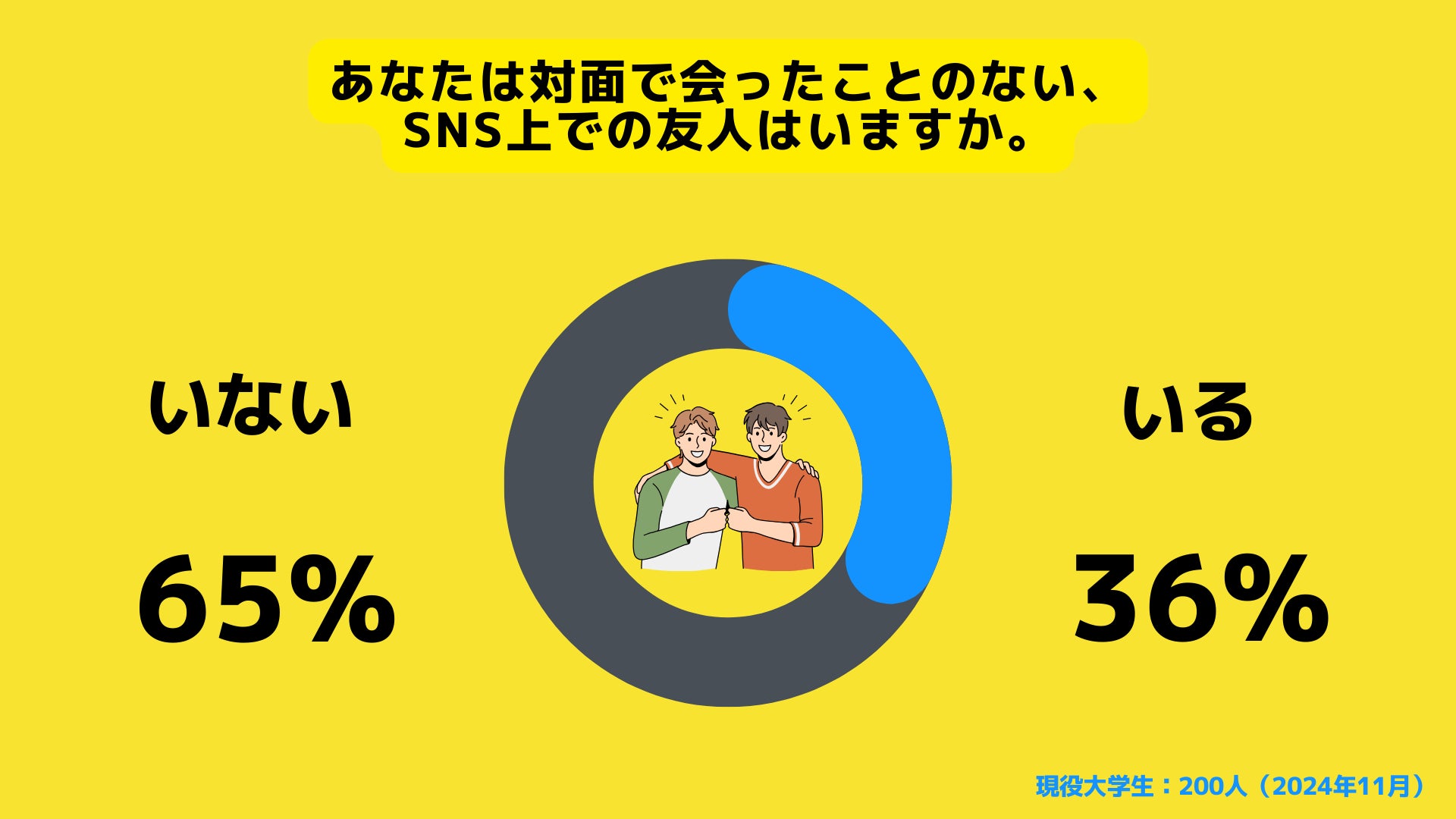 現役大学生に、実際に対面であったことはないSNS上での友人はいるか聞いたところ、36%の大学生が「いる」と回答しました。
