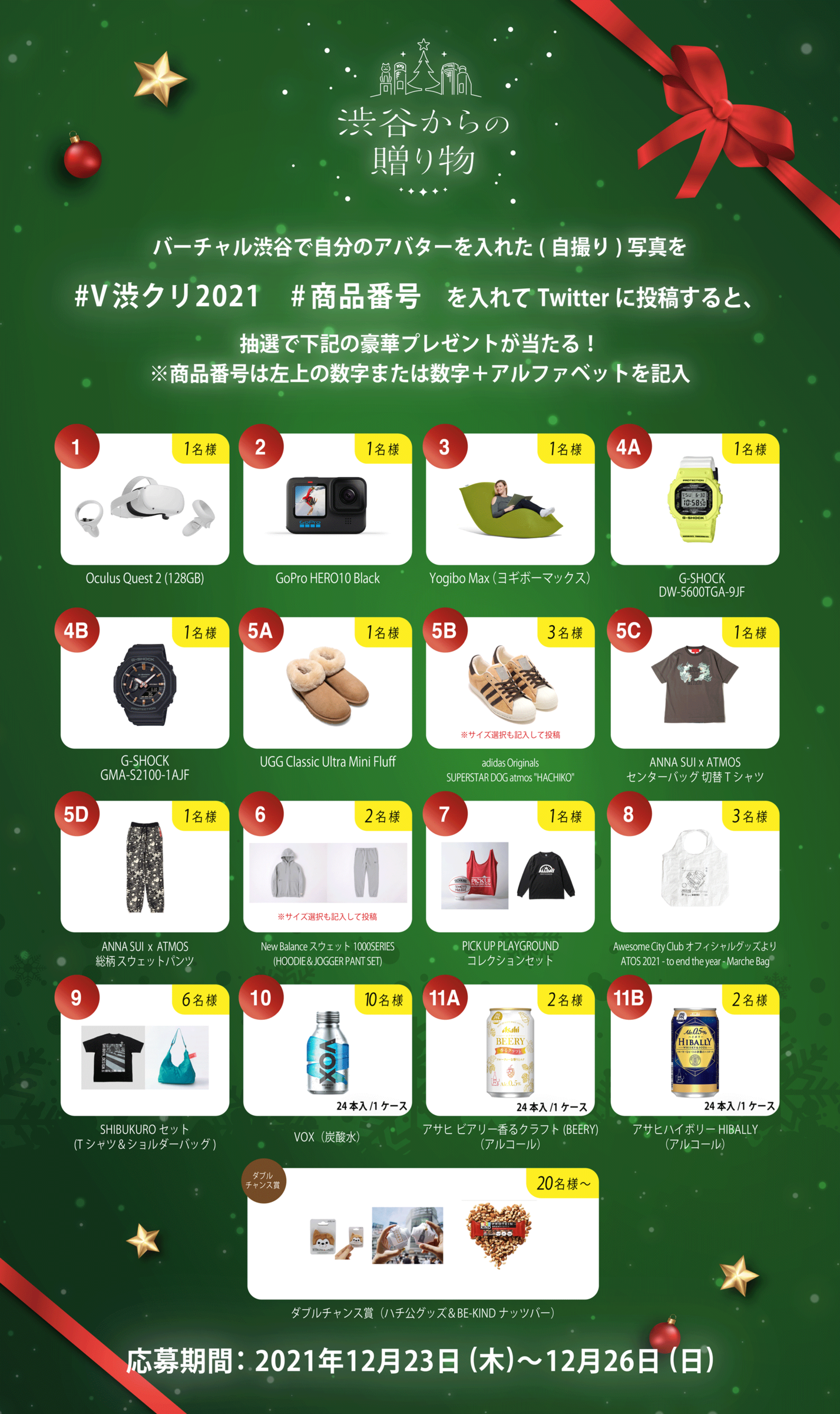 KDDI株式会社、一般社団法人渋谷未来デザイン、一般財団法人渋谷区観光協会を中心とする「渋谷5Gエンターテイメントプロジェクト」は、渋谷区公認配信プラットフォーム「バーチャル渋谷」内で、12月23日から26日にかけて開催する「バーチャル渋谷 au 5G X’mas 2021」にて、期間中「渋谷からの贈り物」と題して、人気のVRヘッドセットやカメラ、時計やスニーカーなど話題の22アイテムを合計50名以上に抽選で当たるプレゼントキャンペーンを開催します。