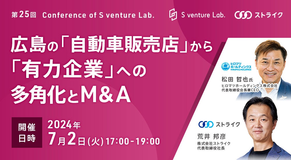 第1部ではこれまで数々のM&Aを実施し、自動車関連事業以外への進出を主導した、ヒロマツホールディングス株式会社 代表取締役会長兼CEO 松田 哲也氏と、株式会社ストライク 代表取締役社長 荒井 邦彦が『広島の「自動車販売店」から「有力企業」への多角化とM&A』と題したトークセッションを行います。
