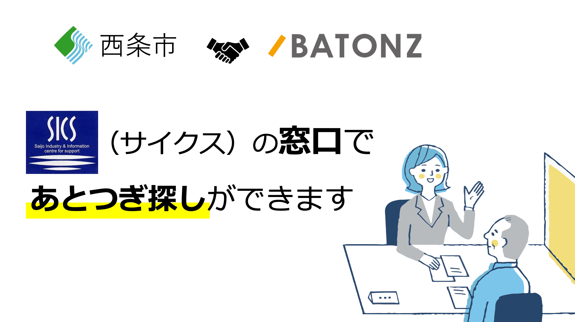 M&A総合支援プラットフォーム「BATONZ(バトンズ)」を運営する株式会社バトンズ(本社:東京都千代田区、代表取締役:神瀬悠一、以下バトンズ)は、愛媛県西条市(市長:玉井敏久、以下西条市)、株式会社西条産業情報支援センター(本社:愛媛県西条市、代表取締役:越智三義、以下SICS)とともに「西条市×BATONZ 事業承継ホットライン」を開設しましたのでお知らせします。