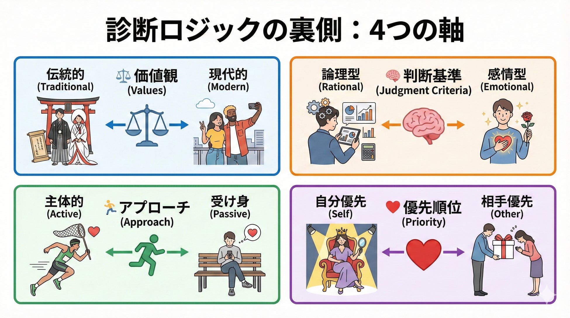 本診断の精度の高さは、単なる直感ではなく、ロジカルな「4つの軸」の組み合わせによって支えられています。