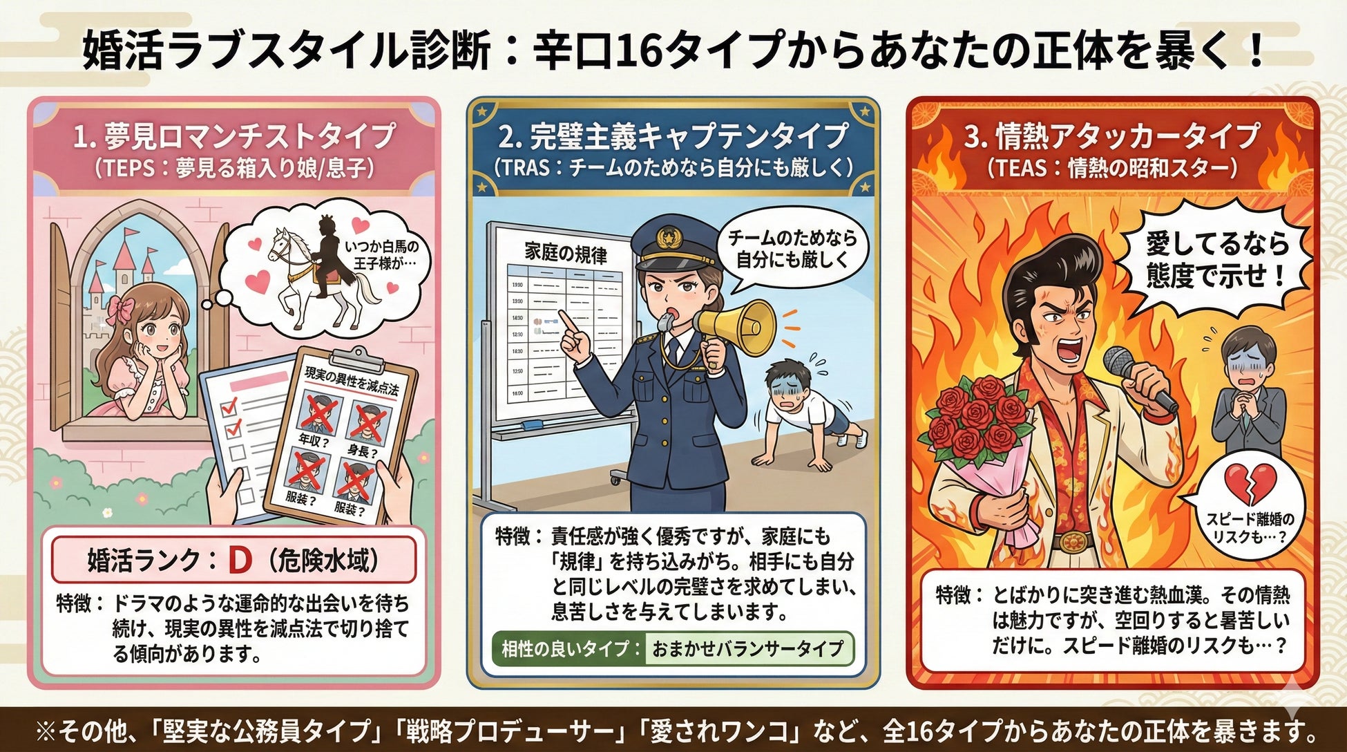 【辛口】あなたの婚活ランクはS?それともD?結婚道場が「愛の16タイプ」で結婚できない理由を暴く『婚活ラブスタイル診断(β版)』を公開